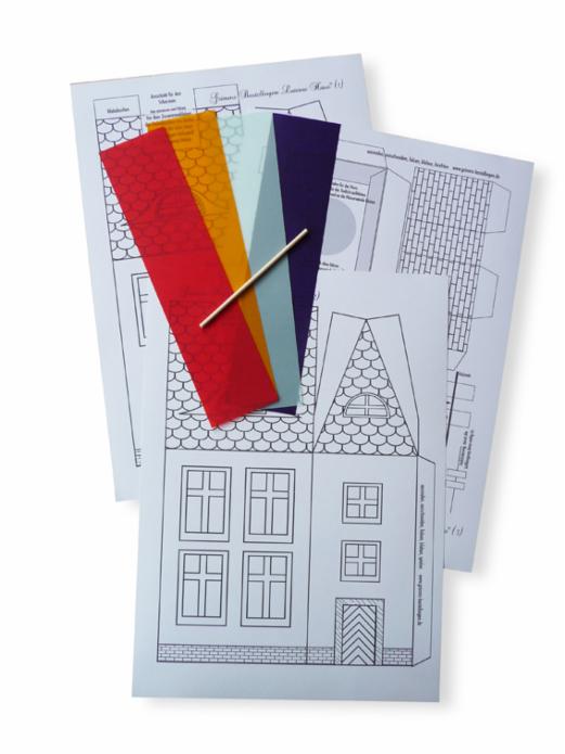 Dazu 4 Streifen farbiges Transparentpapier und ein Holzstäbchen, welches dann als Aufhängung für den Laternenstab dienen kann. Außerdem eine farbige Anleitung mit Musterbildern. Das Ganze in einer