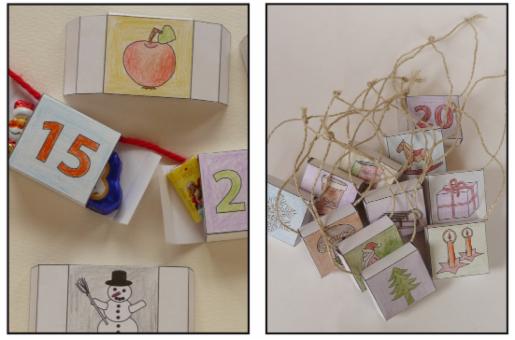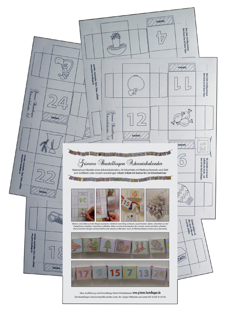 Material zum Basteln eines Adventskalenders, 24 Schachteln mit Weihnachtsmotiv und Zahl zum Auffädeln oder einzeln anzuhängen Inhalt: 6 Blatt A4 Karton für 24 Schächtelchen